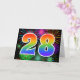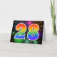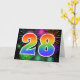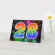 The front of this exciting, fun, and vibrant greeting card design features a colourful celebratory fireworks inspired pattern, along with the number "28" featuring a multicolored rainbow inspired gradient pattern, on a black coloured background. The inside features a customisable greeting message, or could perhaps be cleared and left blank if a message is to be written by hand instead. A greeting card like this might be a fun, happy way of sending a message to somebody who is celebrating their twenty eighth birthday, or perhaps to a couple celebrating their twenty eighth wedding anniversary, or to somebody celebrating some other 28th event. [~Z0000342]