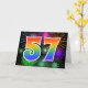 The front of this exciting, fun, and vibrant greeting card design features a colourful celebratory fireworks inspired pattern, along with the number "57" featuring a multicolored rainbow like gradient pattern, on a black coloured background. The inside features a personalised greeting message, or could perhaps be cleared and left blank if a message is to be written by hand instead. A greeting card like this could perhaps be a fun way to acknowledge somebody’s fifty seventh birthday, or perhaps a couple’s fifty seventh wedding anniversary, or some other 57th event. [~Z0000342]
