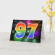 The front of this exciting, fun, and vibrant greeting card design features a colourful celebratory fireworks inspired pattern, along with the number "97" having a multicolored rainbow like gradient pattern, on a black coloured background. The inside features a customisable greeting message, or could perhaps be cleared and left blank if a message is to be written by hand instead. A greeting card like this could be used to send a message acknowledging somebody’s ninety seventh birthday, or perhaps a couple’s ninety seventh wedding anniversary, or some other 97th event. [~Z0000342]