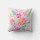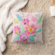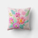 This pillow features a feminine and beautiful colourful bouquet of assorted flowers in shades of pink, orange, yellow and white, which are complemented with green and aqua leaves on a soft pink background.