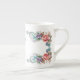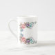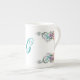 Elegant white bone china mug, with graphics of colourful floral arrangements and a single letter monogram, on the front. Matching tea pot is available.