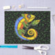 Image is my original painting. This colourful smiling abstract lizard is hanging on a branch with a large leaf at the end. Fun for kids. He is done in greens, blues, yellows, and oranges. See my store Art by MAR for matching products with this design.