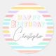 This customisable round colourful fun stripe Happy Birthday sticker features a vibrant pastel striped border and playful rainbow lettering, making it the perfect happy birthday sticker, personalised birthday sticker, or custom name birthday sticker for party favours, gift bags, invitations, or envelope seals. Easily personalise the elegant script with any name, and use this pastel birthday label as a rainbow birthday party favour, party bag sticker, birthday envelope seal, kids birthday sticker, gift tag sticker, or birthday celebration supply to create a memorable and uniquely tailored celebration.