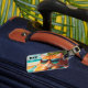 Luggage tag featuring a colourful painting of a funny cat with sunglasses, lounging on a tropical beach
