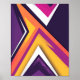 A vibrant abstract design with intersecting arrow shapes in purple, yellow, orange, pink, and white. The composition features sharp angles, halftone dot patterns, and layered elements, creating a dynamic sense of motion and energy, ideal for modern and futuristic themes.