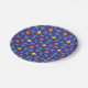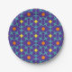 Colourful geometric pattern featuring blue cross shapes, orange circles, and yellow star-like shapes on a deep purple background. Bright and symmetrical.