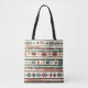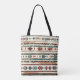Elevate your style with this tote bag featuring a vibrant and intricate design of horizontal stripes with various geometric shapes and motifs. The patterns include diamonds, arrows, and star-like shapes in colours such as red, teal, black, and white. The colourful patterns stand out beautifully against the white background, and the bag has durable black handles. Perfect for daily use, beach trips, or as a thoughtful gift for someone special, this tote bag is both stylish and practical.