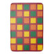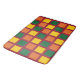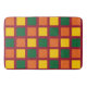 Stylish colourful Bath Mat with geometric squares in yellow, green and orange, against a burgundy background. Modern addition to your bathroom decor.