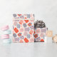 Fun and whimsical wrapping paper featuring illustration of gift boxes with bows and pattern in red, pink, blue, and purple colours.