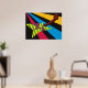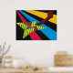 The lively, stripy backdrop adds an extra dimension to the design, creating a sense of movement and rhythm that complements the essence of the guitar. The contrasting stripes enhance the overall visual impact, ensuring that this poster is a true standout piece.