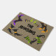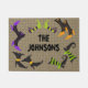 This fun and colourful custom Halloween door mat features your family name and unusual witch boots strewn over a rustic faux burlap doormat. Shown is the editable name, Johnson, in seasonal text. From Heard_.