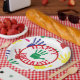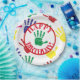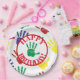 Fun and colourful 5th birthday party design features a pattern of brightly coloured hand prints in red, green, yellow, purple and pink on a white background. In the centre is a solid white circle with red trim. Inside the circle is a larger green hand print and text above and below in bold red font that says Happy Birthday. This is an adorable and colourful fifth birthday party theme! Matching invitations and postage also available!