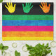 This vibrant design bursts with colour, featuring a lively mix of abstract swirls in pink, yellow, orange, green, and blue across the top, paired with a bold black stripe showcasing rainbow-coloured handprints. Below, textured horizontal stripes in the same bright hues complete the composition. The playful mix of shapes, hand motifs, and vivid tones creates a joyful, high-energy look that celebrates creativity, individuality, and expression. Its bold contrast and artistic textures make it a dynamic and eye-catching pattern.