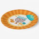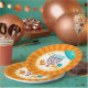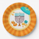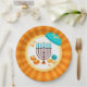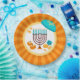 Bright, colourful Hanukkah party design with orange rays, menorah, gelt, dreidel, sufganiyah doughnuts, and yamaka.