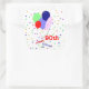 A fun, cheerful and colourful 90th birthday sticker with balloons and confetti.