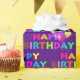 Rainbow Happy Birthday balloons with bold text on purple.