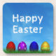 Happy Easter illustration featuring colourful painted Easter eggs in the grass with the blue sky in the back and "Happy Easter" typography written with white clouds.