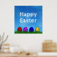 Happy Easter illustration featuring colourful painted Easter eggs in the grass with the blue sky in the back and "Happy Easter" typography written with white clouds.