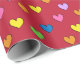 A wrapping paper with a colourful heart pattern on a red background. Customise the background colour among other options.