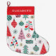 Make the holidays extra special with this personalised Christmas stocking featuring a cheerful pattern of trees, ornaments, presents, and snowflakes in red, pink, and teal. The bold red cuff can be customised with any name, making it a unique keepsake for kids, family members, or holiday guests. Perfect for filling with small gifts, treats, and surprises. This festive stocking adds a playful touch to your Christmas mantel and decor.
