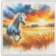 A graceful horse gallops through golden wheat fields, with a dramatic sunset illuminating the sky in vibrant hues of orange and blue. The background features distant barns and birds flying, creating a serene rural atmosphere.