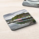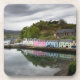 Plastic photo coaster with the colourful fishing harbour houses of Portree town, with reflection in the still water of the sea on the Isle of Skye in Scotland, UK.