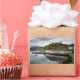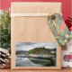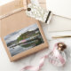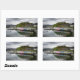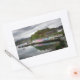 Rectangular photo sticker with the colourful fishing harbour houses of Portree town, with reflection in the still water of the sea on the Isle of Skye in Scotland, UK.