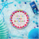 Colourful It's My First Birthday paper plates features kid style text of green, orange, yellow, blue, red, and purple that reads It's My First Birthday, a red decorative ring, and chevron stripes border with an area you can add the birthday child's name!