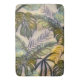 Watercolor Painting of few very large tropical leaves from tropical plants. The leaves are very different in shape and size, and the colours used in this watercolor are mostly warm colours, like yellow and orange, dark grey, dark green and a teal colour leaves. This design shows a rich, luxurious tropical foliage vegetation.