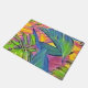 Watercolor Painting of few very large tropical leaves from tropical plants. The leaves are very different in shape and sizes, and the colours used in this watercolor are very strong and vibrant colours, like yellow and orange, lots of pink and green and blue. This design shows a rich, luxurious tropical vegetation.