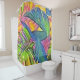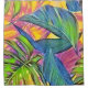 Watercolor Painting of few very large tropical leaves from tropical plants. The leaves are very different in shape and sizes, and the colours used in this watercolor are very strong and vibrant colours, like yellow and orange, lots of pink and green and blue. This design shows a rich, luxurious tropical vegetation.