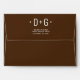 Colourful leaf print and initials brown wedding envelope. The outside of the envelope is of dark brown colour with your initials and address in white on the flap. The inside includes a colourful leaf print pattern. If you want an envelope liner you can delete the leaf print and use the one available in our "leaf print" collection.