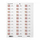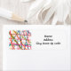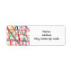 These return address labels have a geometric design of scattered lines in floral colours – shades of pink, orange, yellow, blue, and green.