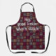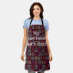 This apron has a mid-century modern design of sets of five coloured lines, alternately horizontal and vertical, repeating across the design on a black background. If you like the design but want different colours, message me.