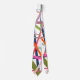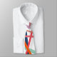 This tie has a geometric design of scattered lines in floral colours – shades of pink, orange, yellow, blue, and green.