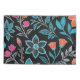 This seamless pattern features a variety of colourful flowers and leaves on a dark background. The flowers are in a variety of colours, including red, orange, yellow, pink, purple, and blue. The leaves are blue and grey.