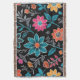 This seamless pattern features a variety of colourful flowers and leaves on a dark background. The flowers are in a variety of colours, including red, orange, yellow, pink, purple, and blue. The leaves are blue and grey.