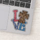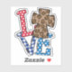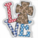This is a cute, colourful "LOVE" design with an animal-print cross representing the "O". The other letters are red or blue with polka dots or checks within the design.