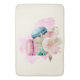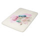 A bath mat with a delightful image. 3 colourful macarons, pink, green and blue with a fancy rose floral bouquet and a splash of pink watercolor. Delicious and stylish too! Light yellow background.