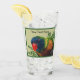 This glass tumbler for beverages has a colourful macaw parrot with a red beak in front of green leafy plants on a light green background with a dark green border. Customise your text with the template.