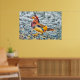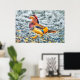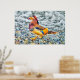 A mandarin duck is an exotic looking perching duck with amazing plumage. The male drakes have purples, greens, and oranges in its plumage, whle the females look a bit like a wood duck hen. The drake also has amazing feathers along its neck, and interesting wings that look almost like fins. Although native to the Far East, some mandarin ducks have made their way westward, and frequent parks and lakes. This little one was actually following me around the shore of a lake, although I wasn't feeding him. It was amazing to see these amazing and unique ducks up close. This image is based on an original photo with watarcolor effects applied.