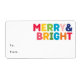 Capture the joy and magic of the holiday season with this unique and festive, colourful merry and bright rectangular gift label. Its simple yet fun design features a rainbow colour palette of red, green, yellow, blue, orange, and pink, creating a vibrant and cheerful atmosphere. The creative and minimalist approach, with bold typography, adds an original and trendy touch. Perfect for children and kids at heart, this design embraces a light and casual feel, spreading happiness with its cheerful wording. Celebrate December in style with this delightful greeting!