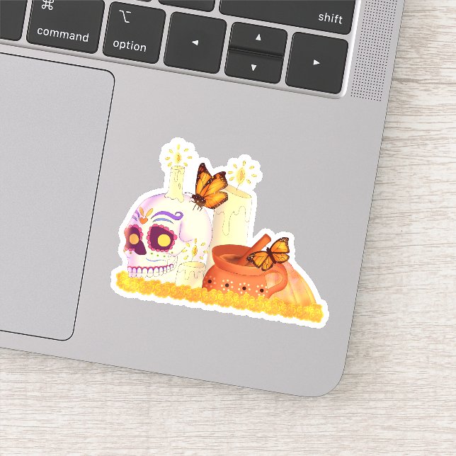 This design features a sugar skull,marigold flowers,coffee, candles and butterflies