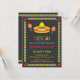 Plan a colourful Mexican Fiesta for a kids birthday party! This invitation is perfect with its bright choice of colours like red, blue, green and yellow across a black background. It features a Sombrero wide-brimmed hat that has a geometric triangle pattern around the rim of the hat. A pair of maracas to sway with in the party. A colourful stripes pattern decorates the border with chilli at the corners. Have a fun day for music, food and drinks! Personalise easily with your party details.