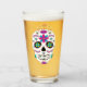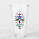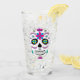 This glass has a colourful, traditional, Mexican sugar skull design.