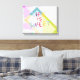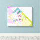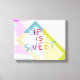 This colourful modern style quote canvas wall art life is sweet text has a geometric bold design with pink, green, blue and purple shapes. Wall art for contemporary decor in home or office.