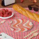 Abstract illustration of colourful, modern retro style waves design in beige, pink, orange, red and pastel colours