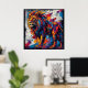 Multicolored lion sculpture designed with intricate mosaic patterns, standing on a neutral background. The artwork exhibits creativity, artistry, and symbolises strength and pride in its vivid and abstract design.