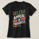 A t-shirt with the motivating slogan "Flex Appeal In Progress" in colourful text typography and graphics including dumbbells and ribbons.