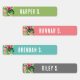 These skinny iron-on labels are great for kids and adults for quickly identifying whose stuff it is. Easily add to clothing and accessories for camping, travel, school and other events. Four different colours with tropical leaves bouquet and customisable white text allows you to add up to 4 different names, or make them all the same. Background and text colours can also be easily changed. Great for employees too!